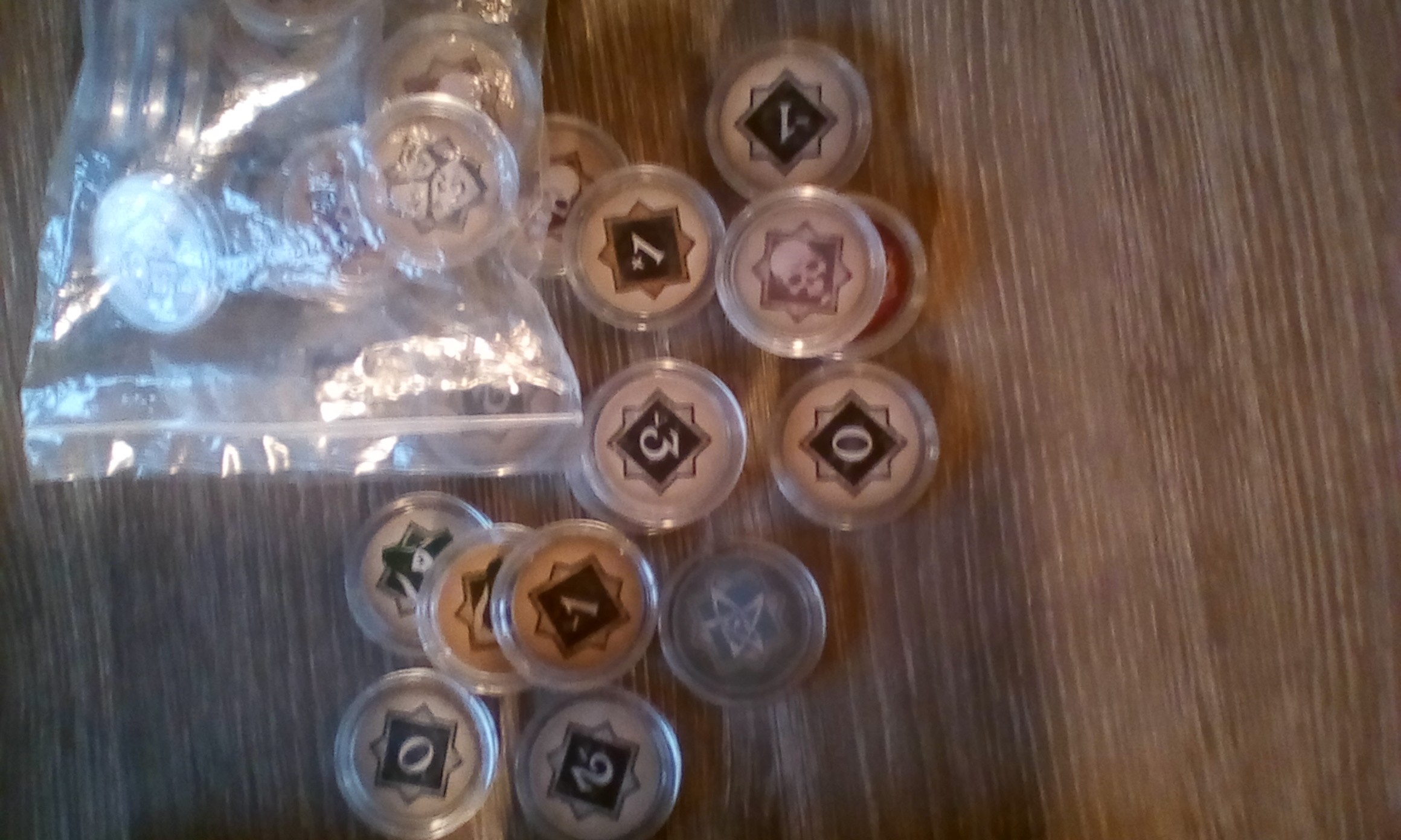 Les jetons chaos sont sous protection plastique pour pièces de monaie (cf photos).