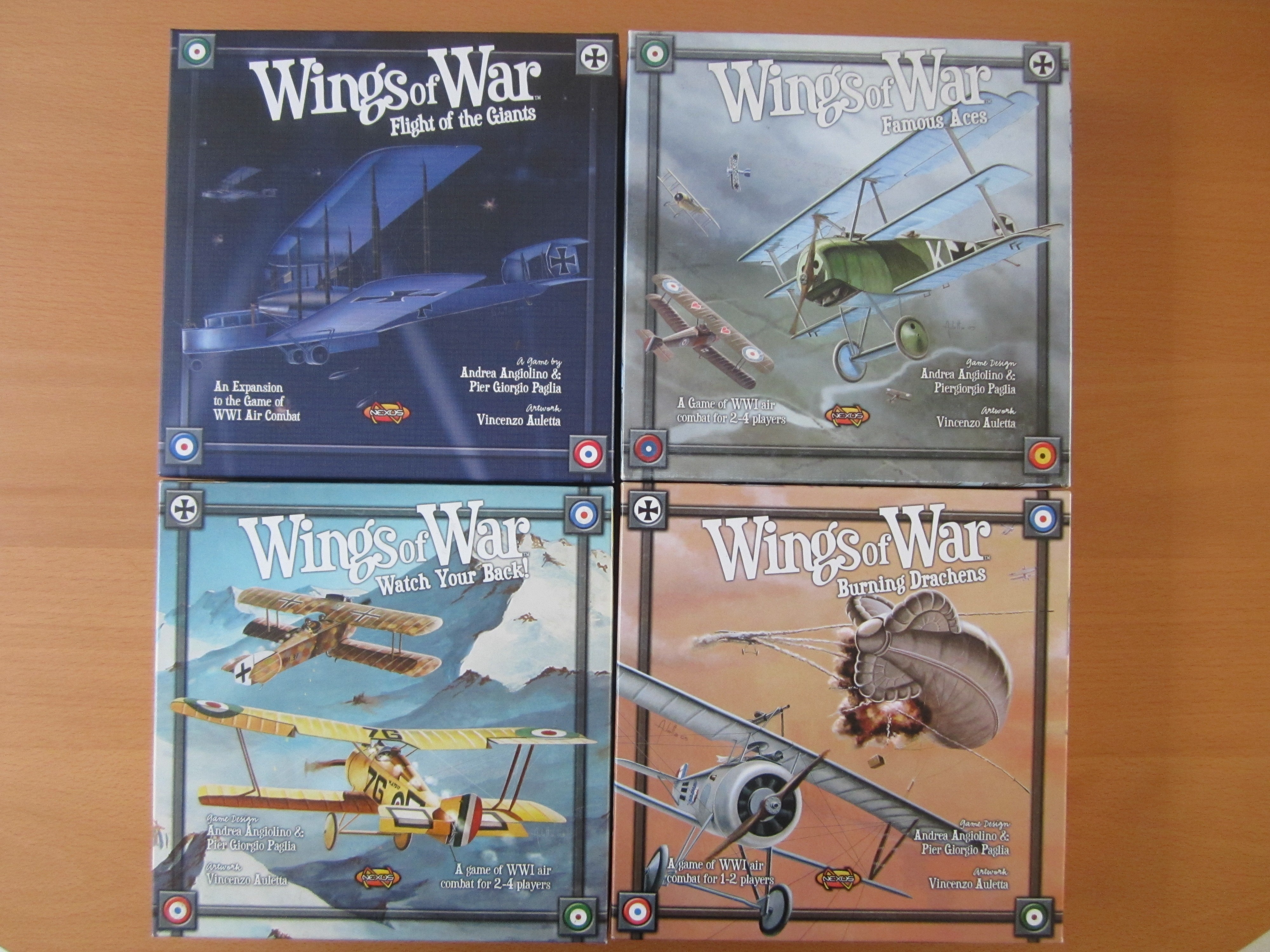 Je vends les 4 boîtes de Wings of War 40 € en VF (la boîte Burning Drachens est en anglais mais j’ai les règles imprimées + pdf en français). La boîte Flight of the giants n’est pas dépunchée.