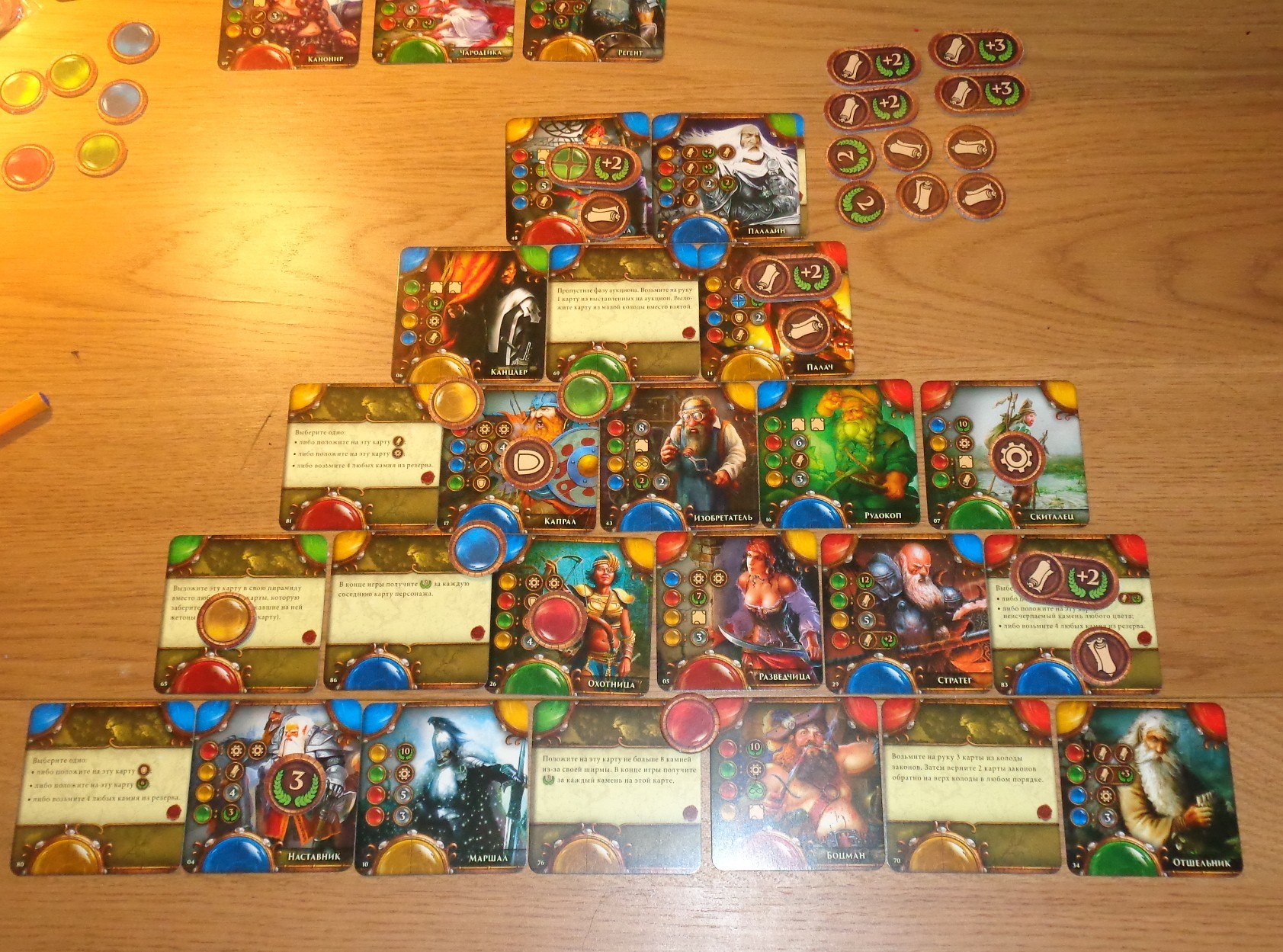 Ca n’est pas le méga high-score mais, tout de même, 137 points. Et je la trouve très jolie cette pyramide. Je me sers une fois de plus de la carte Loi qui permet de doubler les jetons d’un personnage et bien sûr, de préférence au 5ème étage.