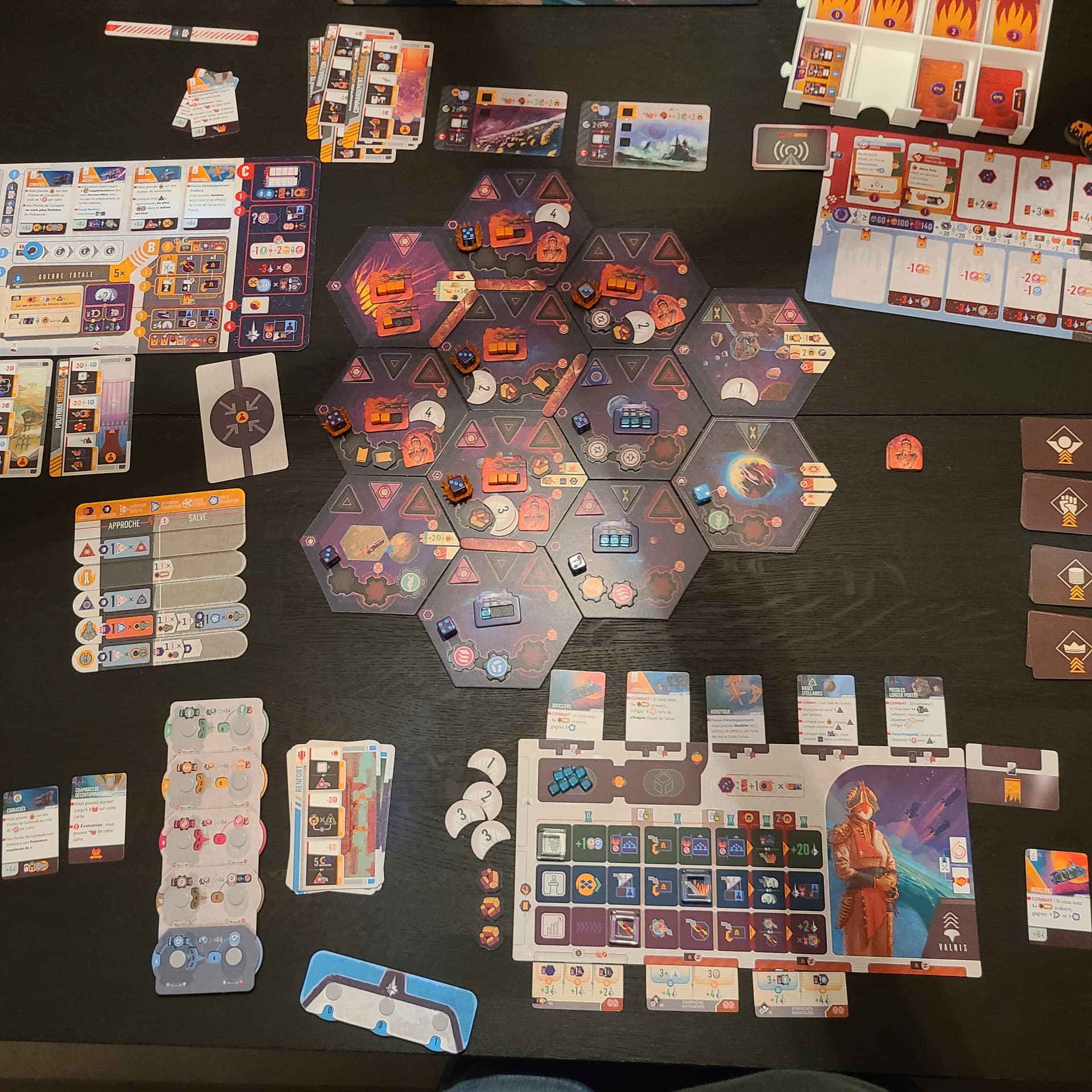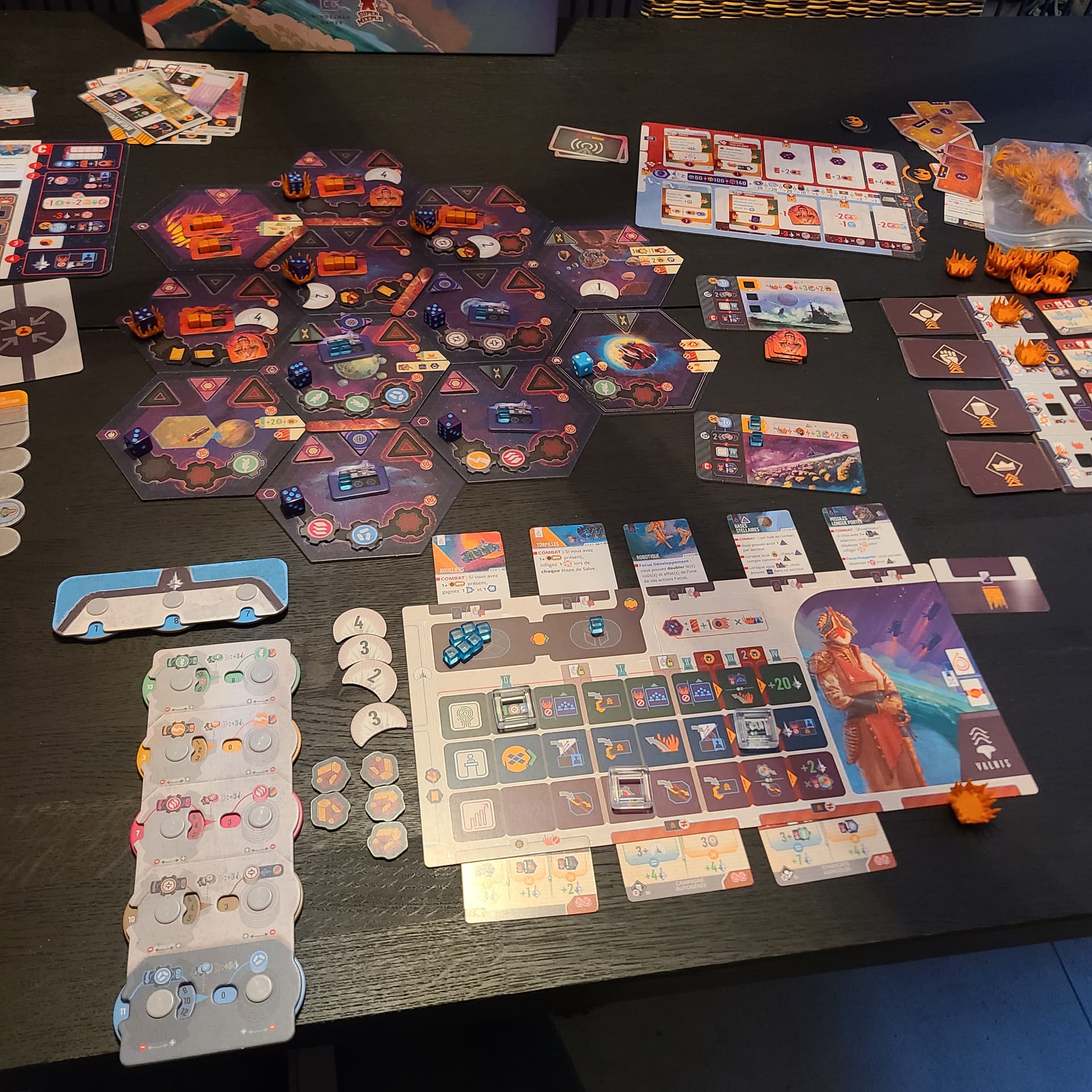 Je commence directement par le scénario 2 du solo avec la maison de base Valnis en mode facile. Très vite le début de partie se déroule sans accros: la technologie bouclier et torpille me permettent de m’étendre rapidement sur un secteur voisin et celui de la maison déchue. Les premières crises (toutes niveau 1) sont gérées et majoritairement résolues sans rejoindre le plateau crise.