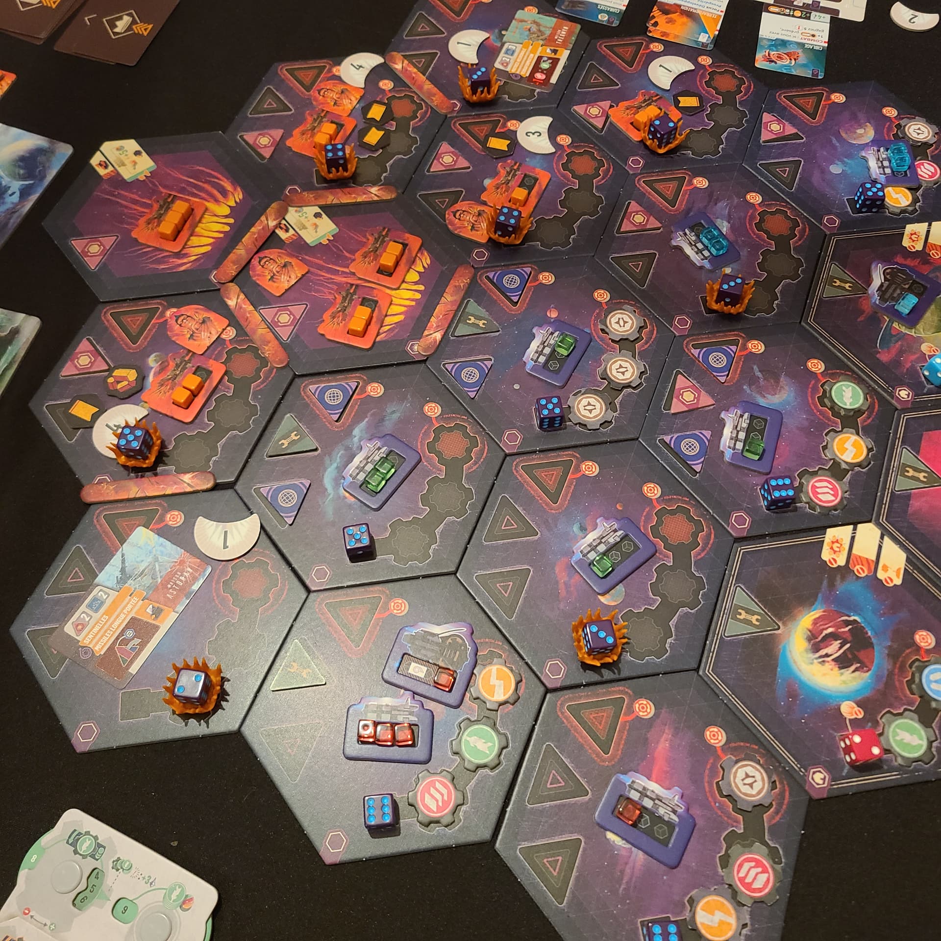 Ce cycle sera du coup plus peinard, surtout que l’événement supprime l’escarmouche de la phase d’évaluation. - Lors du 3ème cycle, le joueur vert qui est depuis le début le plus expansionniste (il a “Bases Stellaires” et “Missiles longues portées”), et qui a le mieux géré sa partie, isole totalement mes secteurs du Néant