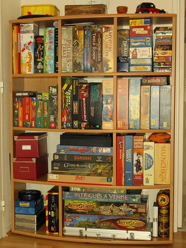 J’ai acheté un meuble spécial pour cela, le problème c’est qu’à force d’acheter des jeux cela dépasse un peu, donc pour économiser de la place comme regrouper toutes les boites de Carcassonne dans une seule. Une photo en mars 2006 :