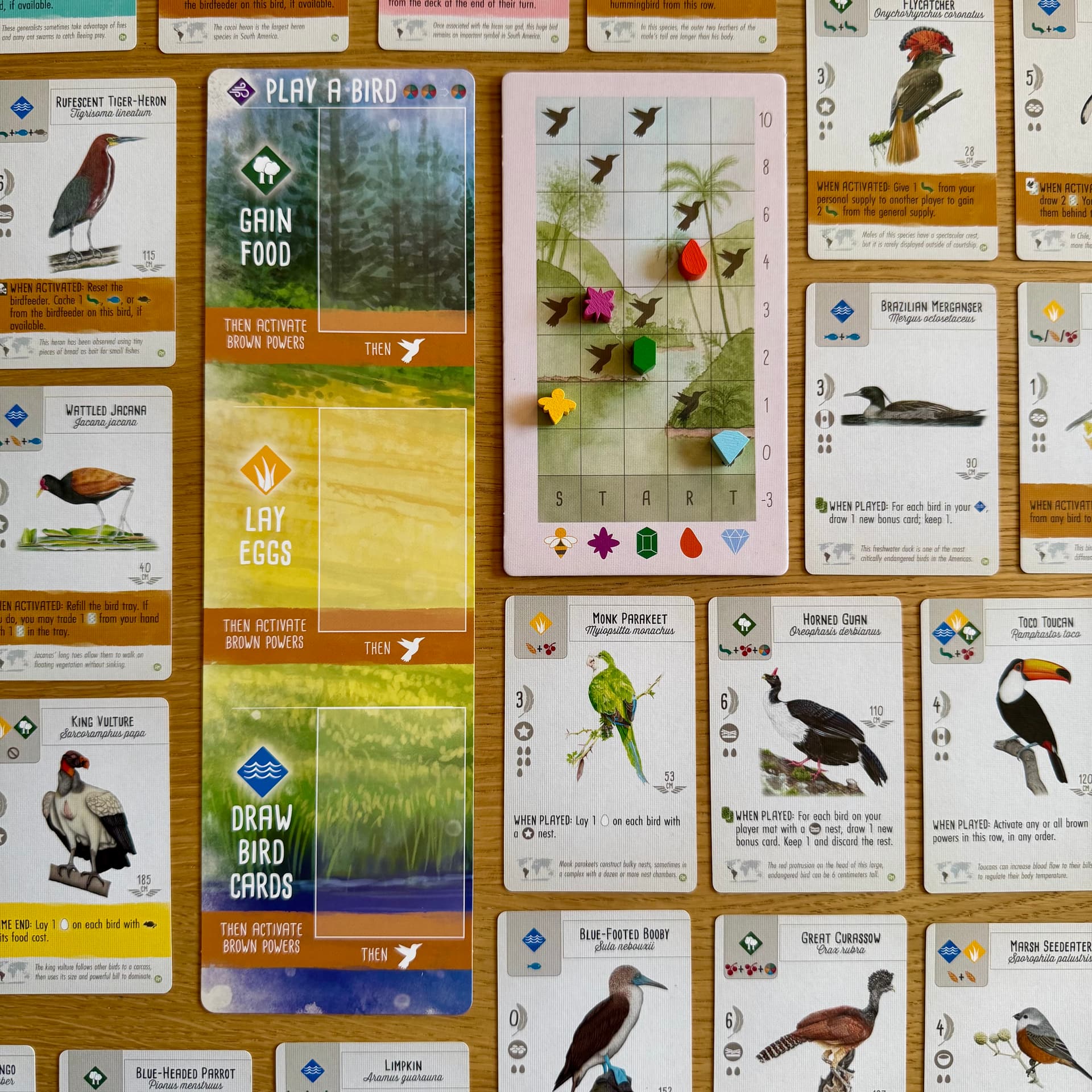 Pour les nouvelles cartes oiseaux, c’est un peu la même chose, ils sont nombreux à offrir des ressources et/ou cartes par des tours de passe-passe. Pendant nos parties on a constaté que la gestion de la nourriture et des cartes était moins tendue. Parfois même on finissait par être plutôt à l’aise si on avait bien maximisé nos actions et nos colibris. Pas d’effet de facilité non plus, il a fallu réfléchir à nos enchaînements.